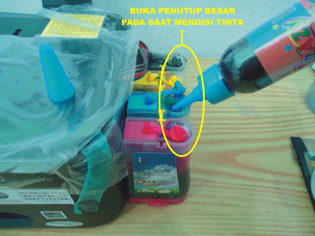 10.   Selanjutnya sedot catridge menggunakan suntik dan penjepit hingga tinta pada botol mengalir ke catridge melalui selang.